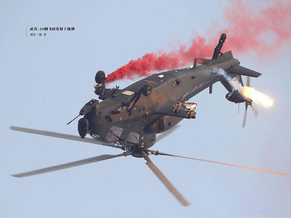 ▲ 武直-10倒飞时发射干扰弹。