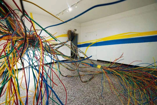在展览现场,何颖宜通过不同颜色的电线将其捆绑在一起,在外交公寓12号空间重新再现了立交桥,看上去杂乱的电线在艺术家的精心布置下,又呈现出一种秩序感。而鲜艳的颜色又让人感受到城市的活力。