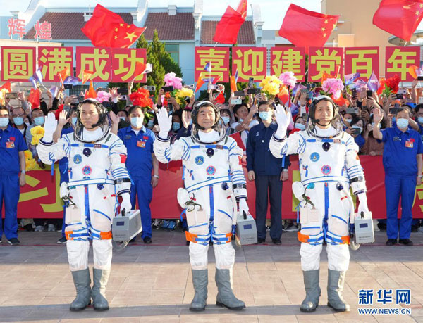 资料图片:6月17日9时22分,搭载神舟十二号载人飞船的长征二号F遥十二运载火箭,在酒泉卫星发射中心准时点火发射,顺利将聂海胜、刘伯明、汤洪波3名航天员送入太空。新华社