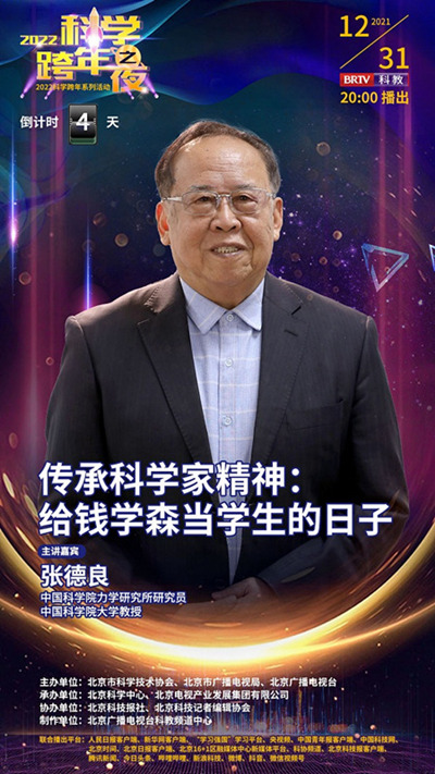 钱学森的学生、中国科学院力学研究所研究员、中国科学院大学教授张德良登上“2022科学跨年之夜”的舞台,讲述给钱学森当学生的日子,传承科学家精神。