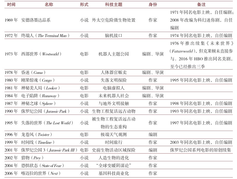 ②迈克尔·克莱顿的创作并不限于科幻题材,表中所列仅为其中被公认的科幻作品。