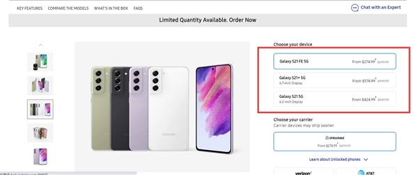 2月8日消息,据Phone Arena报道,三星Galaxy S21 Ultra即将谢幕,新旗舰Galaxy S22系列很快就上市发售。 据报道,三星美国官网已经找不到Galaxy S21 Ultra购买入口,当在Galaxy S21 Ultra产品页面点击“立刻购买”时,官网会跳转到Galaxy S21 FE购买页面。 三星美国官网显示,Galaxy S21系列中仅Galaxy S21、Galaxy S21+和Galaxy S21 FE三款机型可以下单,Galaxy S21 Ultra已被剔除。