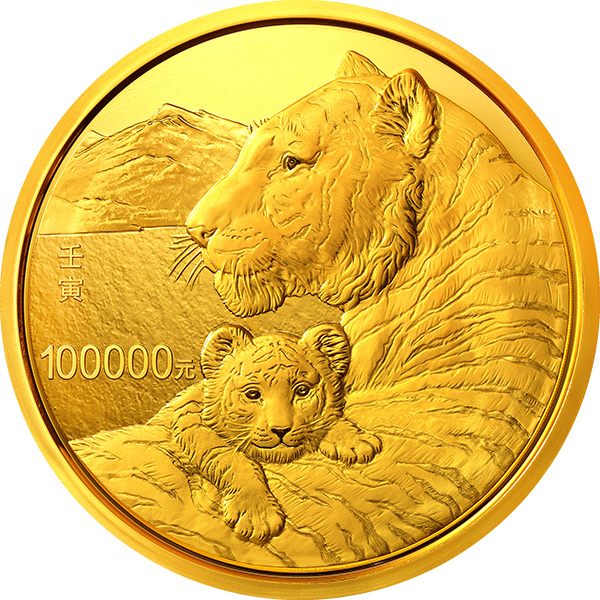 试看10公斤圆形金质纪念币、2公斤圆形金质纪念币,其背面图案相同,均为写实风格母子虎造型,衬以远山等设计元素,并刊“壬寅”字样及面额。画面中,一只幼虎趴在母亲的背上,脸上的表情似乎是在向母亲撒娇,而母虎正偏头凝望着远方,神态温柔、慈爱,它宽阔的背脊与深沉的爱仿佛高山一样。不同于以往虎给人的“威猛”“霸气”的传统印象,这两枚纪念币图案上的虎形象是温情脉脉的,画面整体上充满了和谐与幸福的氛围。