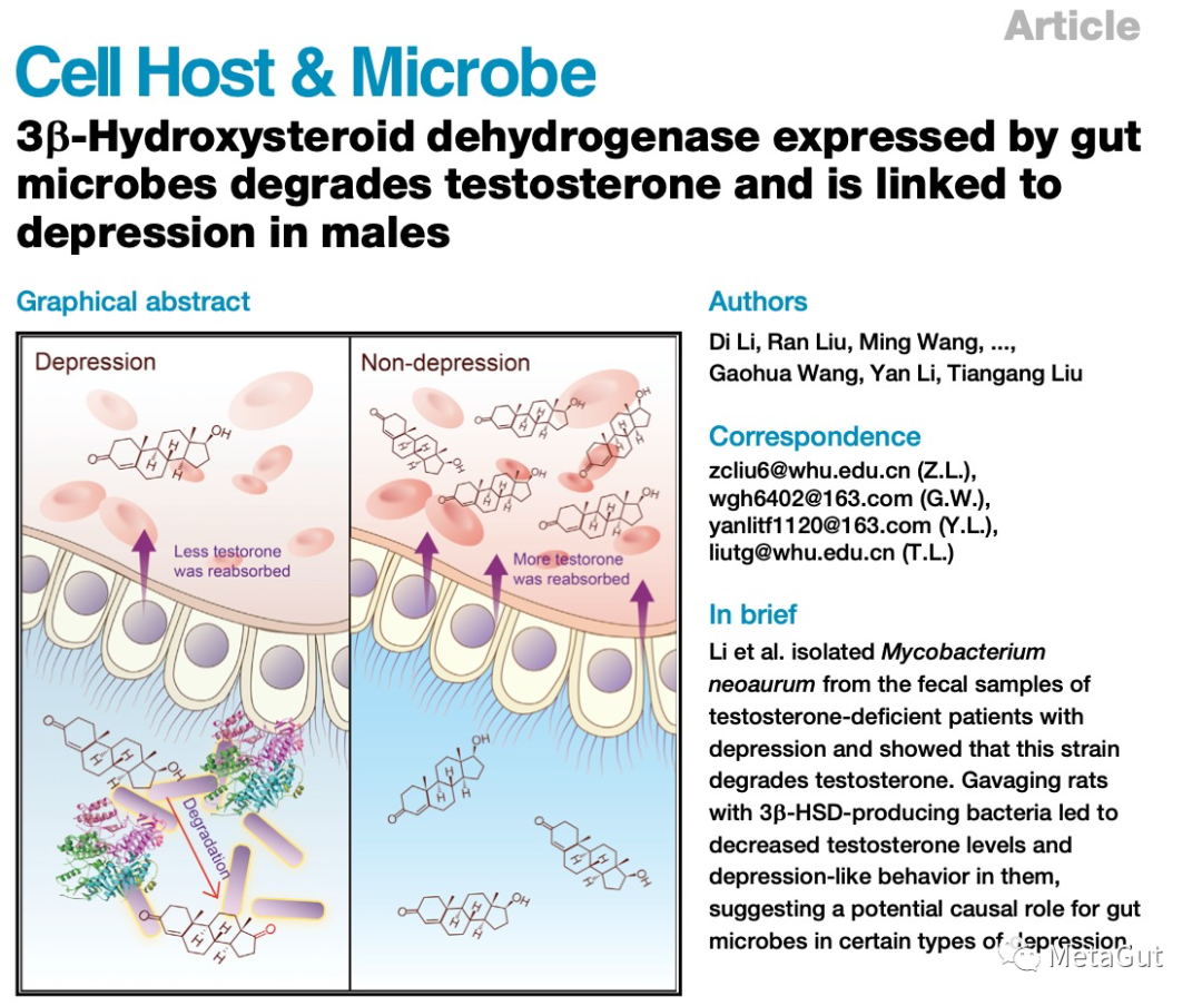 最近,来自武汉大学的一项研究从男性抑郁症患者肠道中分离出了能够降解睾酮的细菌,并确定菌群中专门分解睾酮的基因。