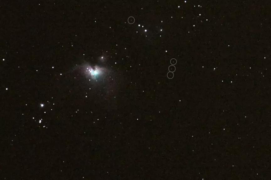 比如下图是笔者在2015年冬天拍摄的猎户座大星云,谈不上是张好片子,因为是户外随兴拍摄,手边只有一个白天拍鸟的长焦相机,也没有赤道仪用来消除地球自转造成的星光拉丝,只好把相机的感光度调得很高很高,以缩短曝光时间。但相机感光度一高,噪点就噌噌噌地上去了,让人无法分辨一些亮点究竟是真恒星呢,还是卫星或太空垃圾呢,还是相机自己的噪点呢?