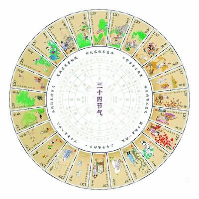 二十四节气系列邮票共分四套发行,每套表现一个季节的六个节气,第四套已于2019年发行。全套24枚邮票形成一个圆,既表达了四季周而复始、气韵流动的理念,同时也传达了中国古代文化中圆满、圆融的概念。