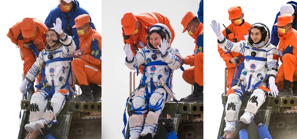 2022年4月16日,神舟十三号载人飞船返回舱在东风着陆场成功着陆。这是航天员翟志刚、王亚平、叶光富(左至右)安全顺利出舱(拼版照片)。