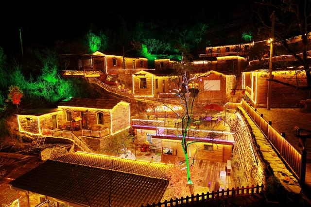 暮色降临,凉风习习,远山如黛。芝麻峪村亮起景观灯,灯光勾勒出小山村的轮廓,如梦似幻。
