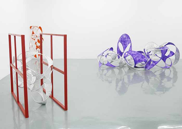 王成普的“空间分割”系列作品是他“根号二与空间”系列作品的延伸。“根号二”系列从正方形出发,利用重力的逻辑组合图形。王成普认为,“垂直”和地心引力相关,他在用椭圆分割空间时也会考虑椭圆之间构成的角度。完美的“垂直”仍然是人类理性的规定,但在圆环之间,空间的分割是偶发的。艺术家用铝箔纸覆盖那些叉开的空间,“看不见”的面显现出来,不同朝向的曲面随之出现,原本处在内部的曲面翻转到外部,作品的形态已经从欧式几何走向了非欧几何。当两个椭圆以特定方式组合扭动时,它们之间的曲面发生了奇妙的变化——绷紧的铝箔以取最短路线的方式形成了优美的凹凸。王成普说,作品看上去虽然抽象,但如果把西方古典的写实雕塑局部放大看,我们会发现它们都遵循着同样一种规律,人体的构成和转折方式也是如此。