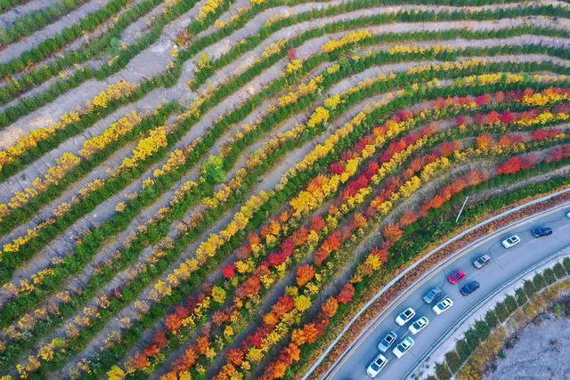 太原市天龙山旅游公路,游客穿行在层林尽染色彩斑斓的山间,欣赏着深秋的美景。当日正值霜降时节,是秋季最后一个节气,市民纷纷走出户外,“打卡”省城热门旅游景点,沉浸体验大自然的美妙景致。