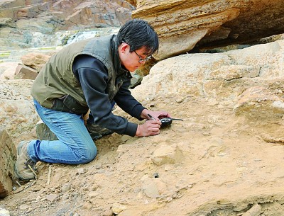 李罡在沂水跋山遗址清理地表化石。受访者供图