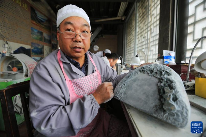 10月24日,艺人在甘肃省定西市临洮县洮砚艺术馆雕刻制作洮砚。