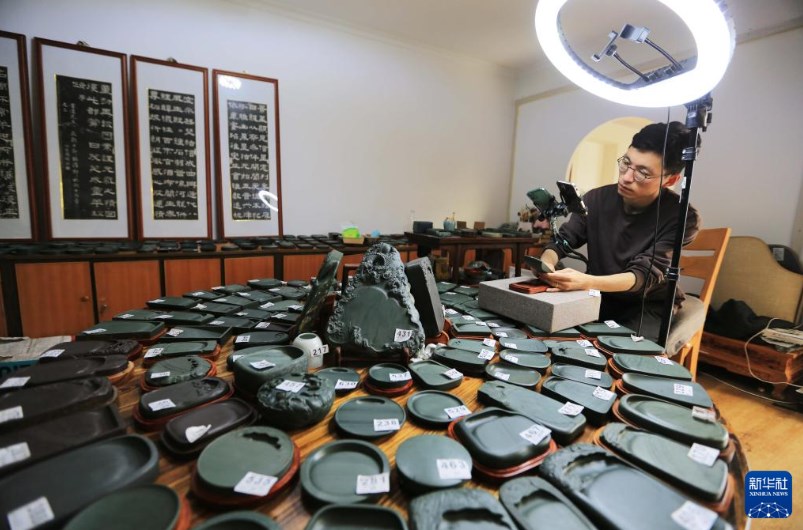 10月24日,工作人员在甘肃省定西市临洮县直播销售洮砚。