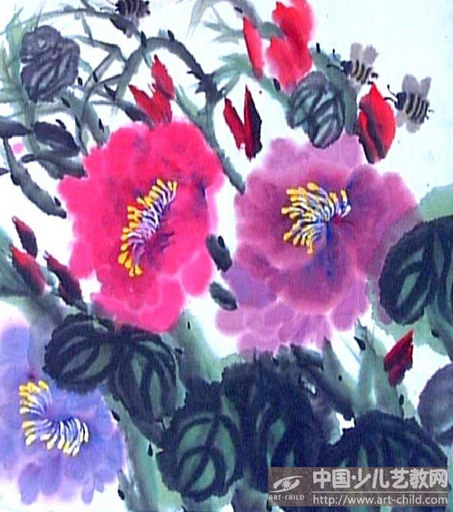 在《少儿画苑》的国际少儿书画大赛中,王天宇小朋友的《采蜜》犹如一颗璀璨的明珠,引人注目。这幅画采用了中国传统的水墨画技法,精心描绘了几朵娇艳欲滴的牡丹花和几只翩翩起舞的蜜蜂。牡丹,作为中国传统的吉祥花卉,象征着富贵和繁荣,如同春日暖阳,给人以希望和美好。