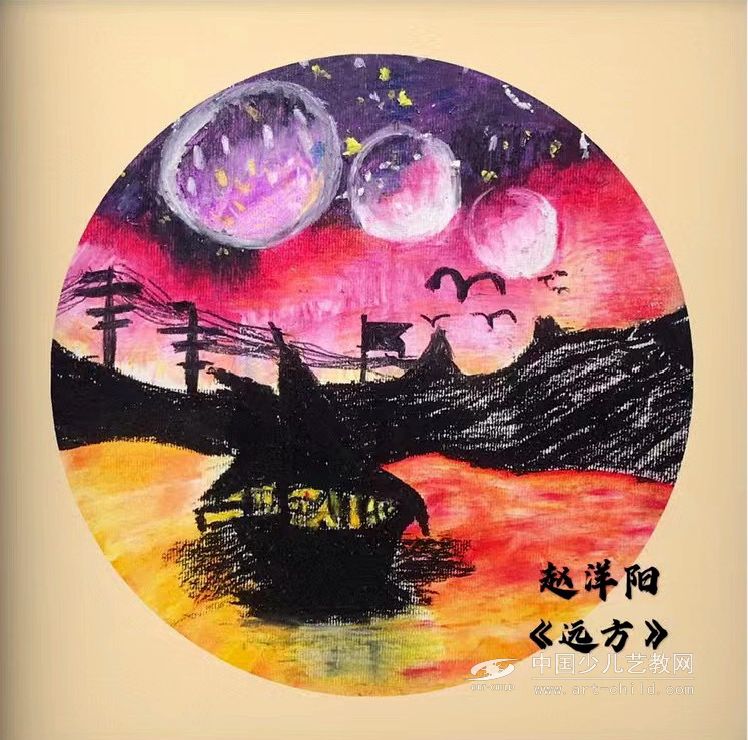 构图上,作品采用了中心聚焦的方式,这种布局不仅突出了画面的主题,还使得整个画面显得紧凑而有序。圆形内部的元素分布错落有致,既保持了画面的平衡感,又避免了单调乏味。同时,圆形底部的桥和山作为画面的延伸部分,增加了画面的深度和广度。在色彩方面,作品运用了紫色、蓝色、红色和黑色等多种色调,营造出一种温暖而神秘的氛围。紫色和蓝色的天空背景,给人以宁静和深邃的感觉。而红色和黑色的点缀,则增加了画面的层次感和对比度,使得画面更加生动有趣。尤其是圆形的底部,桥和山的暗色调与背景形成鲜明对比,引导观者的视线深入画面,探索那未知的“远方”。这幅名为《远方》的儿童画作品,展现了小作者赵洋阳的创意和丰富的想象力。