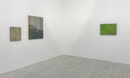 看完在作者画廊的展览,第一感受是,他的画和装置作品并不冲突,确实一脉相承。那种节制的,清冷的,目标明确的。很久以前看过邵译农的一件装置,《3.28平方米私有土地》。一个普通的台球案子上被铺满了苔藓,非常的无力又非常有力。这次展览中只有一件装置作品,是延续的之前的《木本心》系列,每天涂抹的油漆为树木不断添加新的年轮,最后展现出一个树干的七彩断面。这种形态是一种单纯的结果,它虽然消耗了时间,却不强调过程的重要,而指向最终结果的凝聚,也就是回到最终形式的力量当中。这种力量非过程的集聚而不可得,而一旦形成,过程就只成为一种作品的记忆。