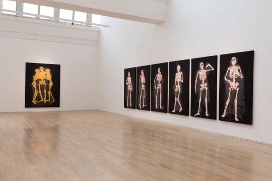 步入展厅是三组以骷髅为主体的平面绘画,艺术家将几件人类文化/美术史中具有清晰辨识度的“思想者”“哲学家”“三美神”形象,以骷髅的形式呈现在画布上。关于这批作品的思考,源于徐渠在国外学习生活期间,城市中随处可见的英雄雕塑,那些铜雕实际为空心。徐渠从东方人的角度,对其内核会是什么样的进行思考。于是,他在被腐蚀过的画布上,创造了这一批外形隐约可见、但已脱离实际肉身的骷髅形象。