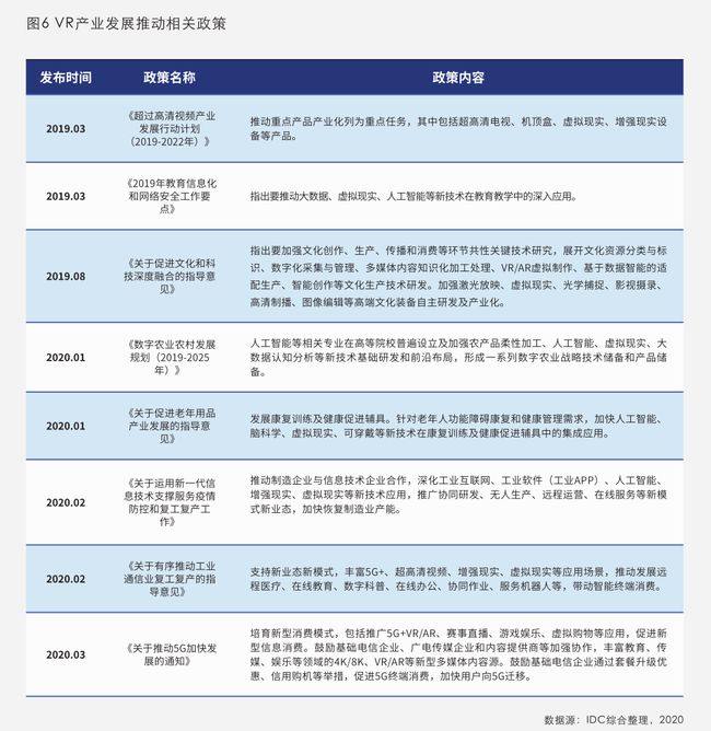 3月15日,备受关注的“十四五”规划和2035年远景目标纲要草案公布,规划纲要草案从打造数字经济优势、加快数字社会建设步伐、提高数字政府建设水平、营造良好数字生态等多方面入手,描绘出未来五年数字中国建设路线。 同时,规划纲要草案明确了未来五年发展目标,并圈定了未来数字经济重点发展的七大产业,VR/AR(虚拟现实/增强现实)与云计算、大数据、物联网、工业互联网、区块链、人工智能并列其中。 虚拟现实和增强现实产业将涉及:推动三维图形生成,动态环境建模,实时动作捕捉快速渲染处理等技术创新,发展虚拟现实整机,感知交互、内容采集制作等设备和开发工具软件、行业解决方案。 此外,“十四五”规划纲要将虚拟现实和增强现实产业列为未来五年数字经济重点产业,赋予了产业新的历史使命,有望加速相关产业链发展 VR/AR技术兴起,建设数字中国 VR/AR作为应用计算机技术,自2015年起开始在我国兴起,是近几年我国大力发展的数字化产业之一,在十四五期间,随着数字中国的建设步伐,VR/AR产业将迎来发展的关键期。 VR/AR产业在我国的发展初期,以穿戴类为主要发力点,针对生活娱乐进行内容输出。2017年起,VR/AR行业走向低迷,而2019年我国不断发布相关政策,推动VR/AR产业的发展。2020年,大众对于VR/AR行业的认知得到进一步加深,除娱乐产品外,VR看房、云展厅等由VR/AR技术所带来的商用化产品逐渐在社会生活中成为习惯。