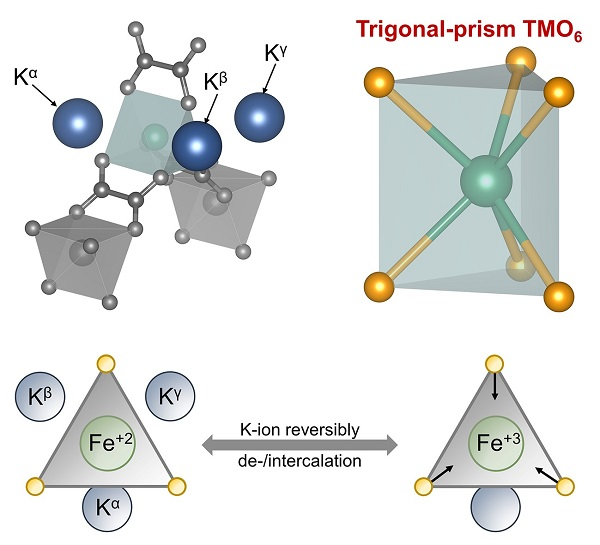 ▲K2Fe(C2O4)2 正极材料的三棱柱 TMO6 结构基因与电化学过程中局域结构演变 | 图源:中国科学院网站
