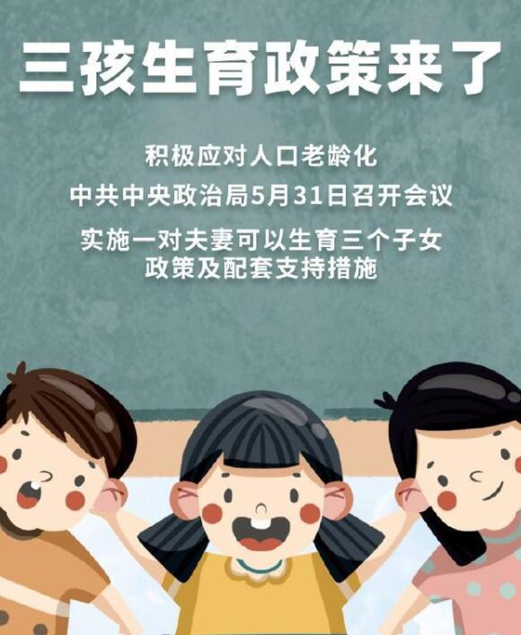 5月31日,中共中央政治局会议指出,进一步优化生育政策,实施一对夫妻可以生育三个子女政策及配套支持措施,有利于改善我国人口结构、落实积极应对人口老龄化国家战略、保持我国人力资源禀赋优势。