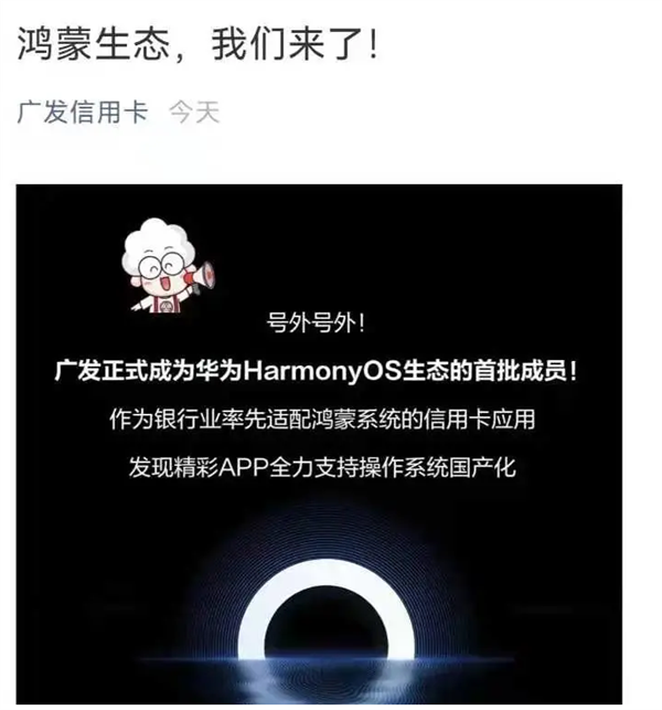 对于这个举措,广发信用卡表示,广发正式成为华为鸿蒙OS生态首批成员,作为银行业率先适配鸿蒙系统的信用卡应用,发现精彩APP全力支持操作系统国产化,而中国银行也表示,携手华为鸿蒙迈入“原子化服务”时代。
