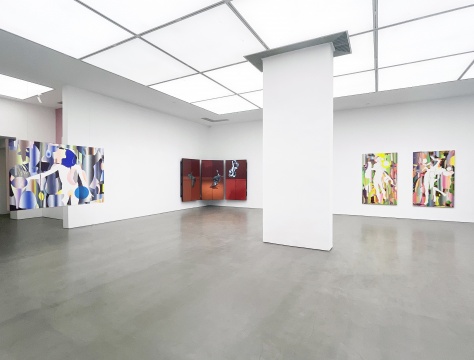 在此次展出的作品中,不难看出LUCY已不再有清晰的轮廓,取而代之的是碎片化的、扭曲的特征。而画面上很多以圆形为代表的几何形体的叠加,来自于叶凌瀚的上网痕迹:如手机截屏的选取与变形。这一灵感来自于网络大数据会搜索人的喜好,并自动推送“猜你喜欢”的商品。叶凌瀚的绘画创作均是先建模再进行绘画。此外,影像中的LUCY也在进行一种夸张的、变形的运动。