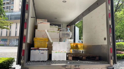 陈祥负责配送都是低温食品,每天早上九点,在结束了一天都本职工作之后,他便需要赶往仓库,做完消杀工作,随即和同事各自开车前往疫区指定的十多个社区配送点。陈祥通常会跑四五个社区,每个区600多份食材包,总共加起来数量近4000份。在到达当地后,他还需要和志愿者一同进行卸货操作,“一箱生鲜里有大概8份食材包,重量达二十斤,一天不知道需要弯腰卸货多少次。”
