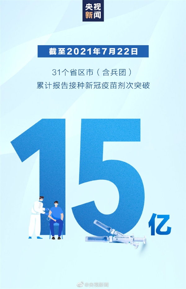 据国家卫健委最新通报,截至2021年7月22日,31个省(自治区、直辖市)和新疆生产建设兵团累计报告接种新冠病毒疫苗150760.5万剂次,突破15亿剂次大关。