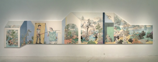 虽是中国画专业出身,但曾健勇对于空间的兴趣已非一两日。从5年前那场名为“编年史”的个展开始,平面绘画与三维空间之间的转换便初露端倪;4年前的“戏法”个展,艺术家在绘画与空间之间相互干预与介入方面的手法愈发纯熟,形式营造的方法也更为多样。