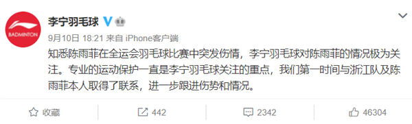 9月10日晚,李宁羽毛球官微回应称:“知悉陈雨菲在全运会羽毛球比赛中突发伤情,李宁羽毛球对陈雨菲的情况极为关注。专业的运动保护一直是李宁羽毛球关注的重点,我们第一时间与浙江队及陈雨菲本人取得了联系,进一步跟进伤势和情况。 ”