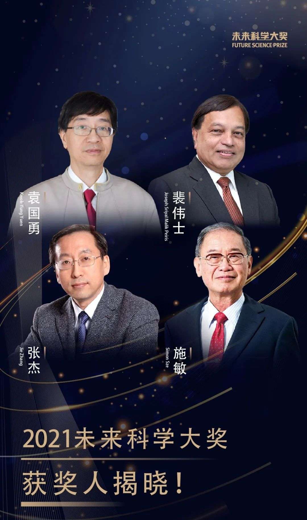 9月12日,北京,未来科学大奖正式揭晓了获奖名单:香港大学教授袁国勇、裴伟士摘得“生命科学奖”;上海交通大学、中国科学院物理研究所教授张杰获得“物质科学奖”;中国台湾阳明交通大学电子工程系暨电子研究所终身讲座教授施敏荣膺“数学与计算机科学奖”。按规定,每个单项奖金为100万美元(人民币约650万元)。