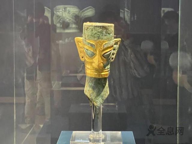 据四川广汉三星堆博物馆学术研究部工作人员杨雨霏介绍,这类戴金面具的青铜人头像出土较少。有学者认为,戴金面具者地位尊贵,是祭祀活动中的重要角色。
