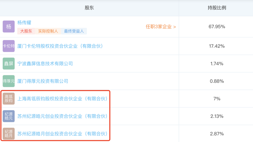 天眼查信息显示,近日,厦门卡伦特科技有限公司(以下简称“卡伦特”)新增股东上海高瓴辰钧股权投资合伙企业(有限合伙)、苏州纪源皓元创业投资合伙企业(有限合伙)、苏州纪源皓月创业投资合伙企业(有限合伙),持股比例分别为7%、2.13%、2.87%,对应高瓴创投持股7%,GGV纪源资本持股5%。