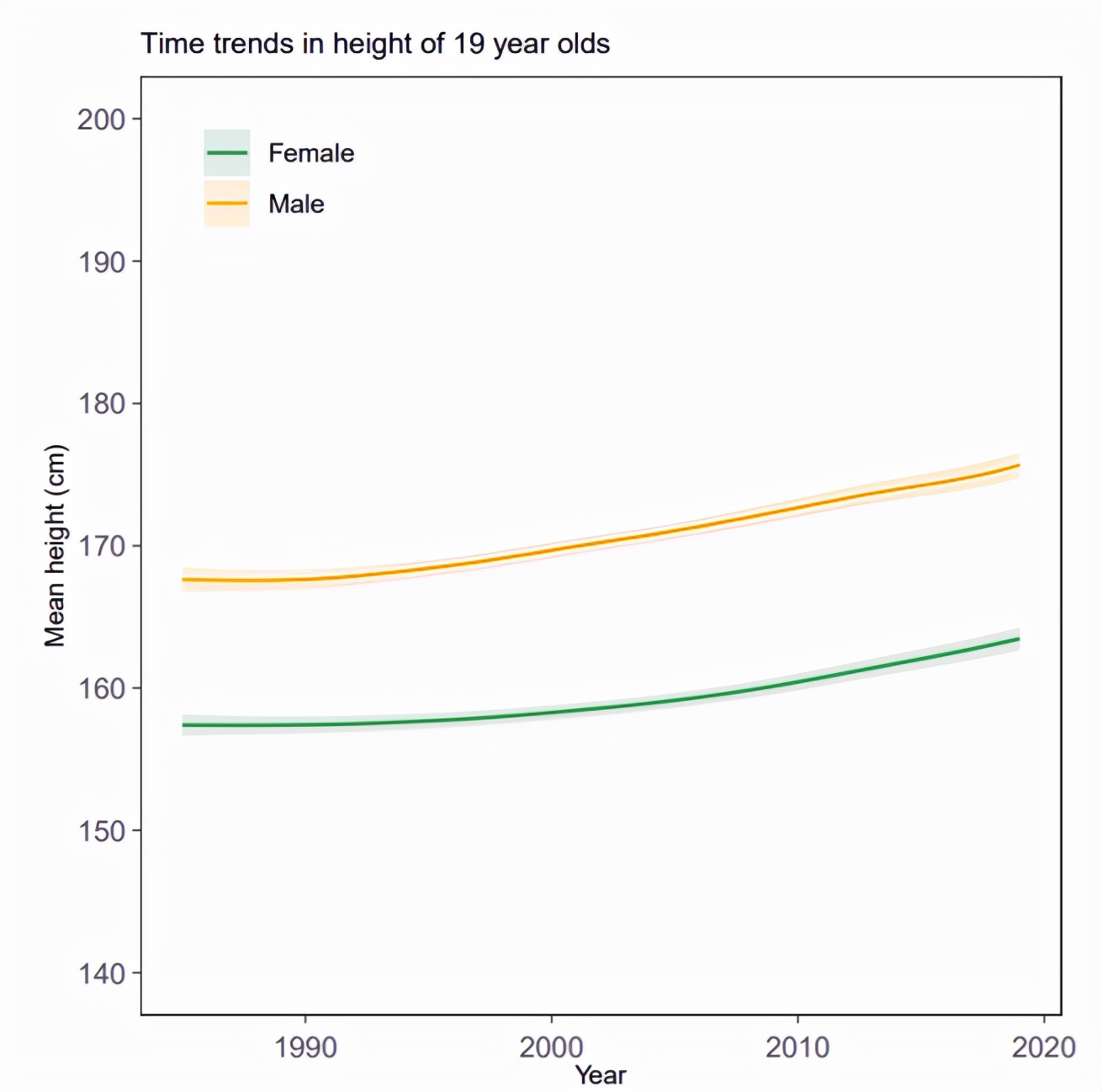 权威医学杂志《柳叶刀》发布过关于全球青少年身高的研究[2],覆盖了全球193个国家的6500万名青少年儿童。研究结果中,有一点特别值得关注,那就是平均身高的变化。