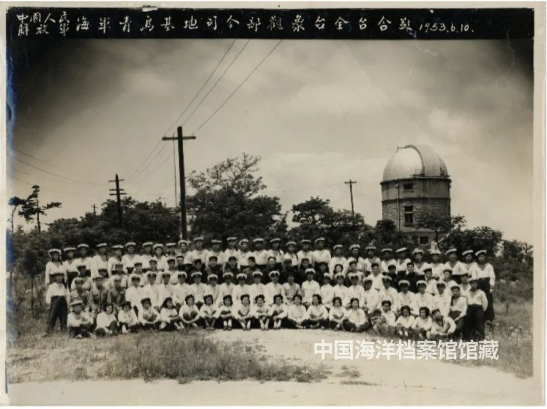 这是一张拍摄于1953年6月10日的青岛观象台全台工作人员合影照片,背景为青岛的标志性建筑——1931年我国自己建造的第一座大型天文圆顶观测室。照片中间分别是时任台长王彬华先生(右)和副台长王铎先生(左)。