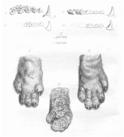图1哈德维克对小熊猫牙齿与掌部的素描(Hardwicke, 1827)