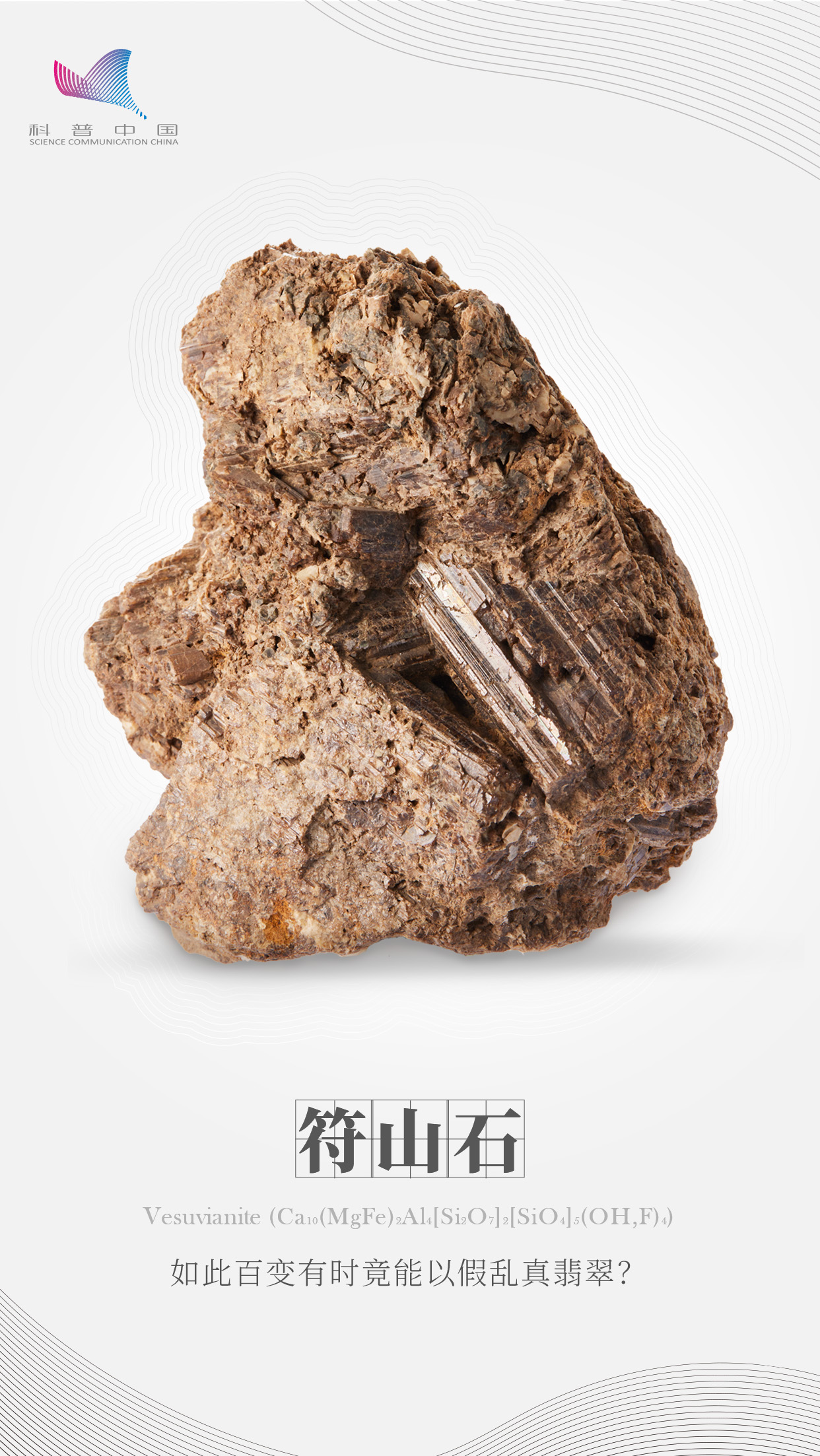符山石是一种的钙镁铁铝硅酸盐矿物,其成分复杂,内部类质同象替代普遍,它的理想化学式与依据大量化学分析计算所得的成分式不完全一致,对其成分结构的研究仍然有待深入。符山石为四方晶系矿物,晶体常呈短柱状,常见四方柱、复四方柱、四方双锥、复四方双锥,集合体常呈粒状、放射状、棒状或致密块状。