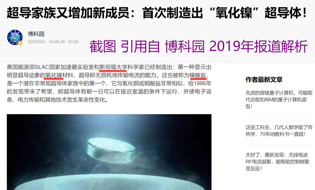 去年八月,斯坦福大学宣布了一个高温超导的新时代:镍时代(如下截图“博科园”去年国内率先报道解析);研究发现,在一类特殊的材料,即所谓的镍酸盐中,存在着很有前景的超导体,这种超导体即使在高温下也可以在没有任何电阻的情况下传导电流。然而,很快就变得明显的是,斯坦福大学这些最初令人叹为观止的结果,无法被其他研究小组复制重现。