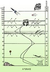 探测结果表明,地球大气圈的顶部并没有明显的分界线,而是逐渐过渡到星际空间的。高层大气稀薄的程度虽说比人造的真空还要“空”,但是在那里确实还有气体的微粒存在,而且比星际空间的物质密度要大得多,然而,它们已不属于气体分子了,而是原子及原子再分裂而产生的粒子。以80-100公里的高度为界,在这个界限以下的大气,尽管有稠密稀薄的不同,但它们的成分大体是一致的,都是以氮和氧分子为主,这就是我们周围的空气。而在这个界限以上,到1000公里上下,就变得以氧为主了;再往上到2400公里上下,就以氦为主;再往上,则主要是氢;在3000公里以上,便稀薄得和星际空间的物质密度差不多了。