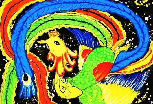 一只姿态婀娜的凤凰,张开翅膀的一瞬间,显得如此高贵,震撼力充斥整个画面。凤凰翱翔天际,她的翅膀充满张力,最终与五彩斑斓的祥云以及蓝天融为一体。多么美的一幅画面啊。