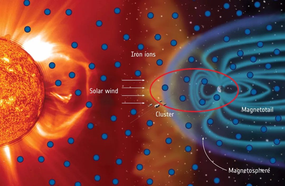 相反,研究人员认为铁直接来自太阳,关于铁的分布和存在数据随着时间的推移而变化,其方式与地球磁场的扰动和太阳活动长期波动相匹配。这表明,地球周围空间中的大部分铁来自通过磁层的太阳风,而不是从地球的大气层向上传播。为了绘制地球空间的组成图,研究人员以一种意想不到的方式使用了欧空局“Cluster Constellation”任务的数据。