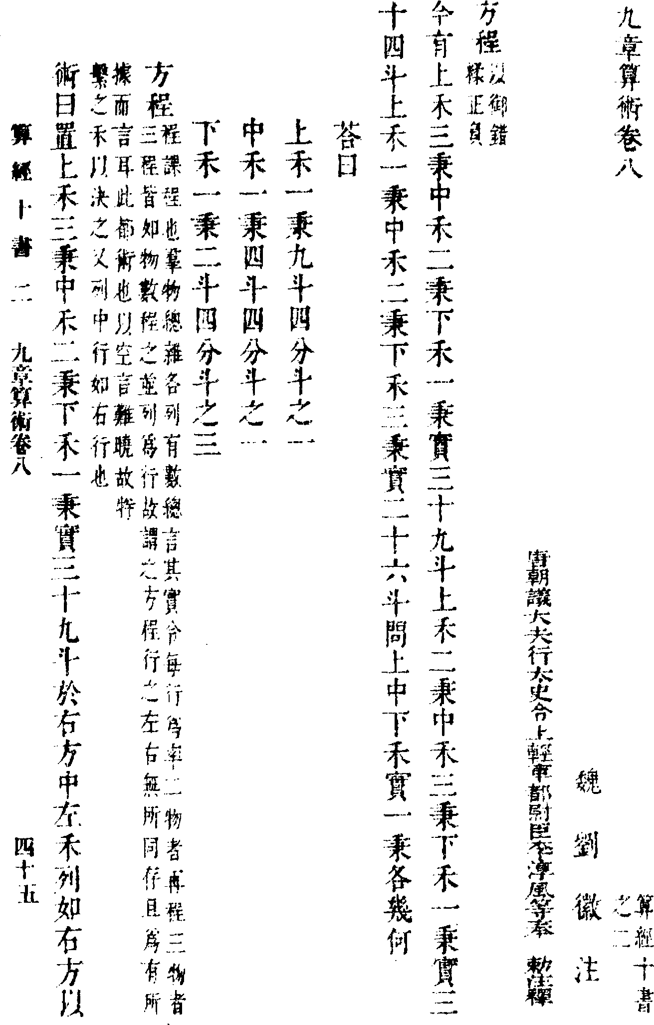 “今有上禾三秉,中禾二秉,下禾一秉,实三十九斗;上禾二秉,中禾三秉, 下禾一秉,实三十四斗;上禾一秉,中禾二秉,下禾三秉,实二十六斗。问上、中、下禾实一秉各几何?”(图3-2)