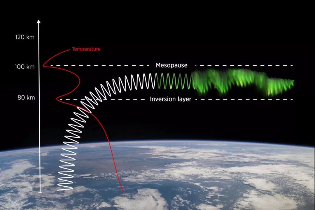 沙丘波的亮度差异可能是由于来自太空不带同电粒子的差异,或者是底层大气氧原子中的波造成,研究最终提出沙丘是氧原子密度增加的结果。接下来,研究小组必须确定大气中氧原子密度的变化是如何导致如此均匀而广泛的波场。通常在研究高度,有许多不同类型的重力波在不同的波长、不同的方向传播,这就是为什么它们不容易形成沙丘所表现出均匀波场的原因。