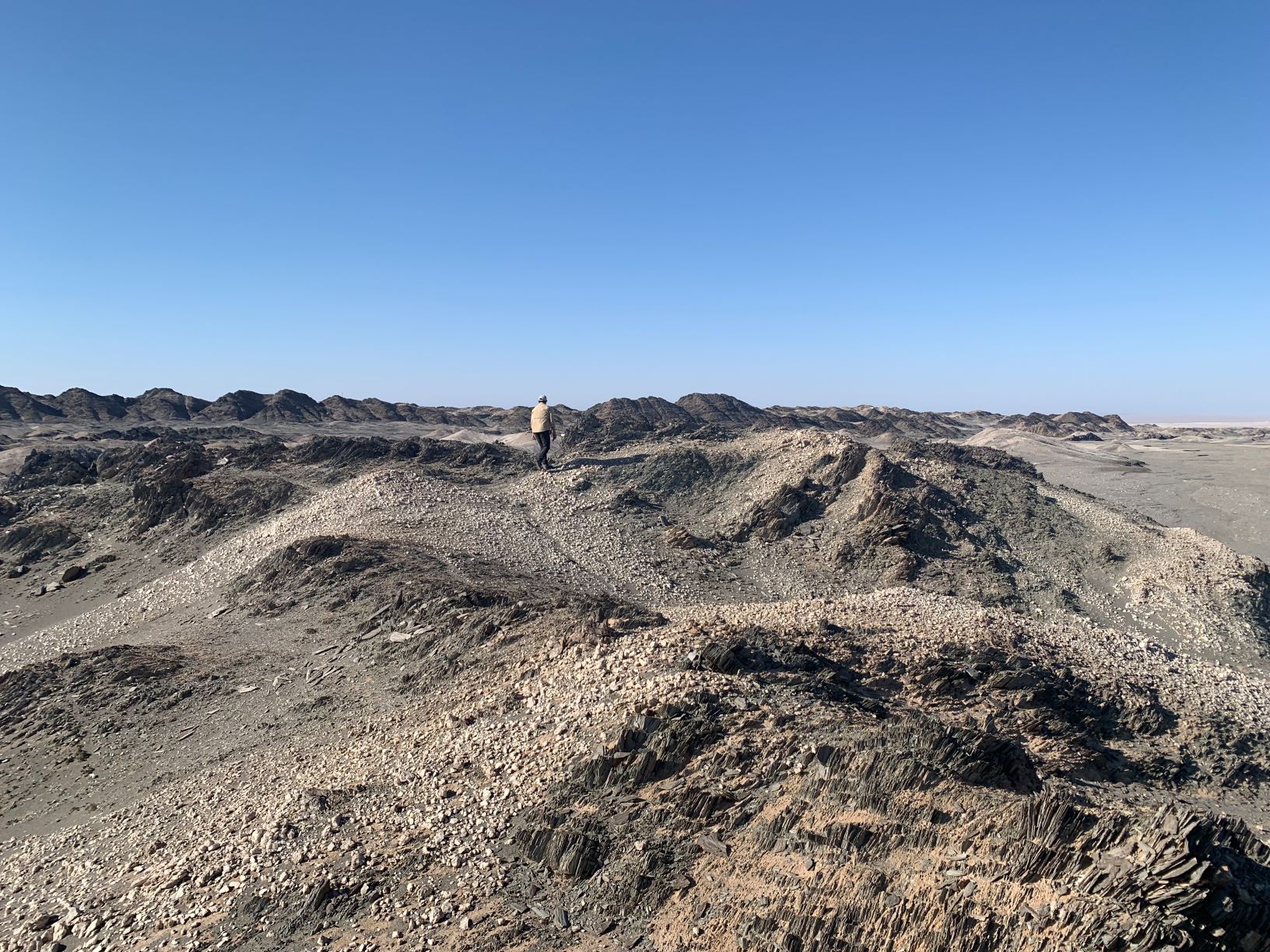这一带的阿尔金山余脉并不高,目测山体高约30-50米的样子,已伸入了荒漠之中。等钻出阿尔金山,前边的沙土堆却意外越来越大,倾斜坡度达到30度以上。因为无路可走,三辆车马力全开,轰鸣着相继冲上了土坡。可上到土坡后,才发现底下一马平川,砾石荒漠无边无际向天边延展开去,科考队的车却再也不能轻易下坡了:脚底下的大坡更深更陡,如悬崖壁立,且布满大大小小的坑荡,沙土极软,继续下冲,后果不堪设想。