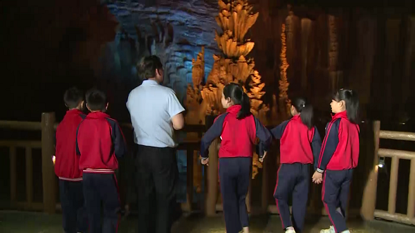 活动中,徐世球带领大家穿过龙湖洞景区门口的化石点、龙湖洞地下河、溶洞、楼兰古城,一直走到鹅管群。沿途通过自然形成的奇特景观为大家讲解了碳酸盐岩相关的知识、各种喀斯特景观的形成原理、龙湖洞鹅管群的相关知识等。并与活动现场的学生进行现场知识问答,以生动活泼的实地教学,为学生与观众进行科普,寓教于乐,在轻松的环境中进行知识教学。