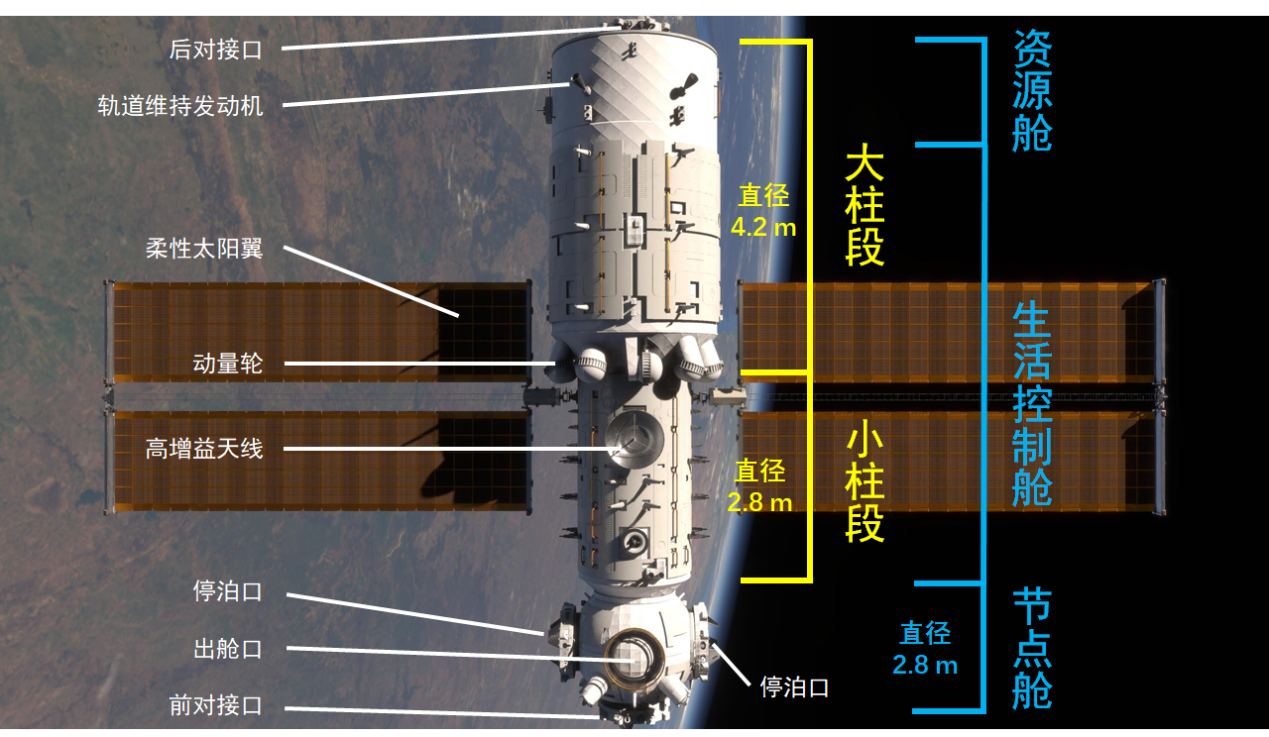 “天和”核心舱构成图(图片来源:由@星智科创团队授权,各部件名称由@冰结向日葵标注)
