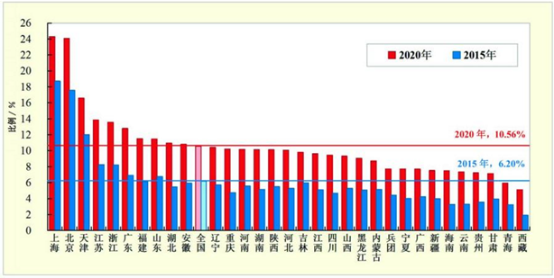 中国各地区公民科学素质水平均有大幅提升,31个省(自治区、直辖市)和新疆生产建设兵团的公民科学素质水平全部达到或超过“十三五”预期发展目标,反映出与经济社会发展相匹配的特征。2020年,上海(24.30%)和北京(24.07%)的公民科学素质水平超过24%,是我国公民科学素质发展的领头雁,除此之外,天津(16.58%)、江苏(13.84%)、浙江(13.53%)、广东(12.79%)、福建(11.51%)、山东(11.47%)湖北(10.95%)和安徽(10.80%)8个省市的公民科学素质水平超过全国总体水平。我国公民科学素质总体水平超过10%标志着我国公民科学素质发展整体进入新阶段,但同时,各地区发展不平衡的问题依然较为突出,如图1。
