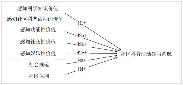 H2:个体对社区科普活动的感知功能性价值(H2a)、感知社交性价值(H2b)和感知娱乐性价值(H2c)越高,其参与社区科普活动的意愿程度越高。