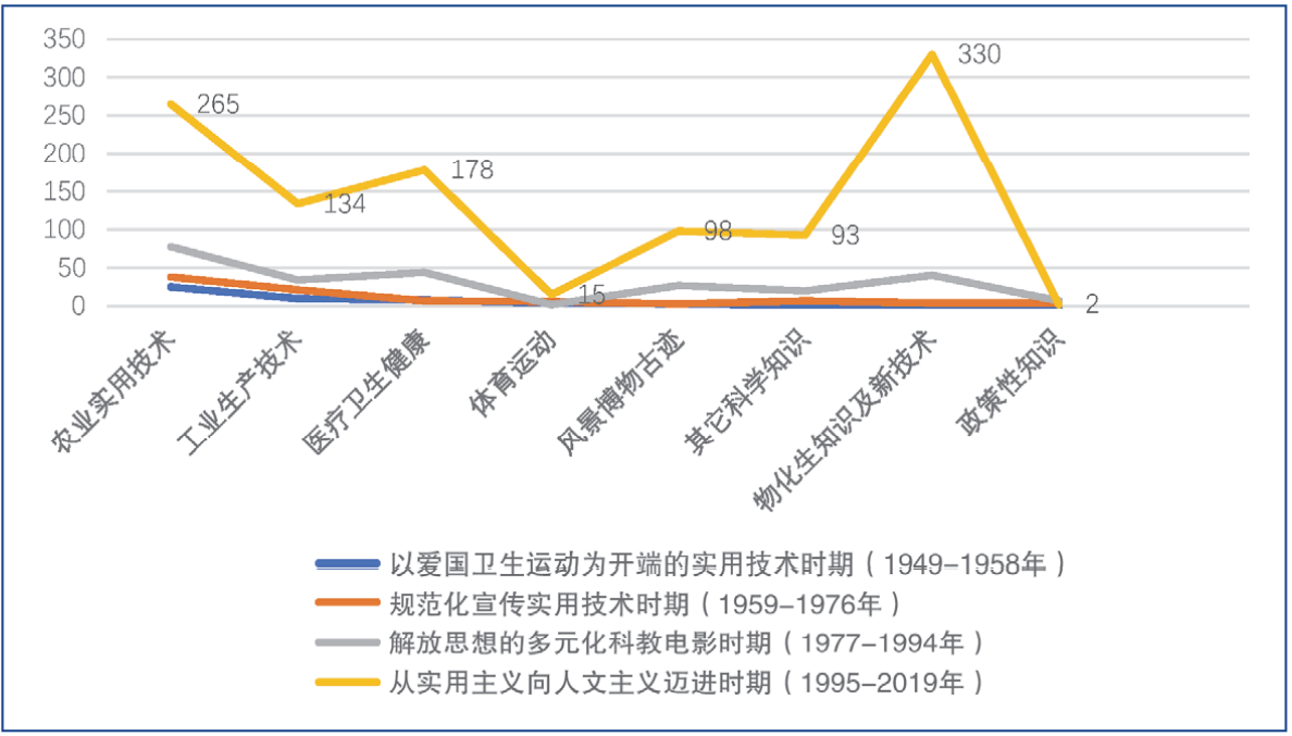 但由于这一时期大众知识水平普遍极度欠缺,传播的科学知识涉及面尚浅,电影向着普及简单科学知识文化的大众传播方向发展,同时紧密结合工农业生产,突出科学技术传播,为大众生产生活服务。