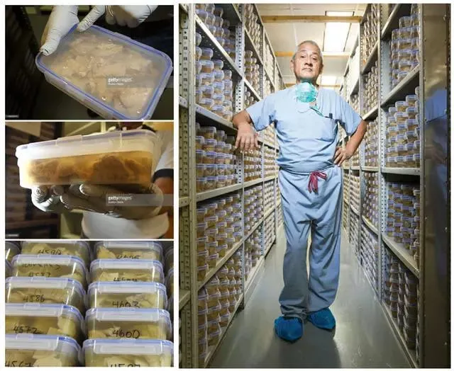 另一个半球在福尔马林中浸泡几周使其固定,然后由一名病理学家检查解剖,接着便可以在室温下储存、等待取用了。